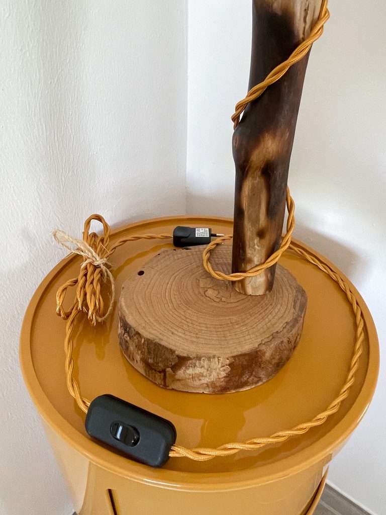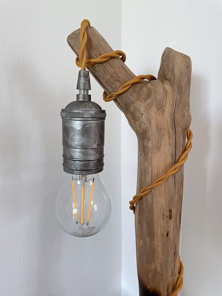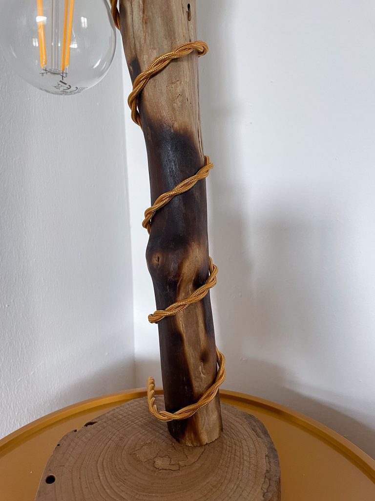 - Matériaux : Bois flotté, socle en ormeau, douille chromé, cordon jaune tressé