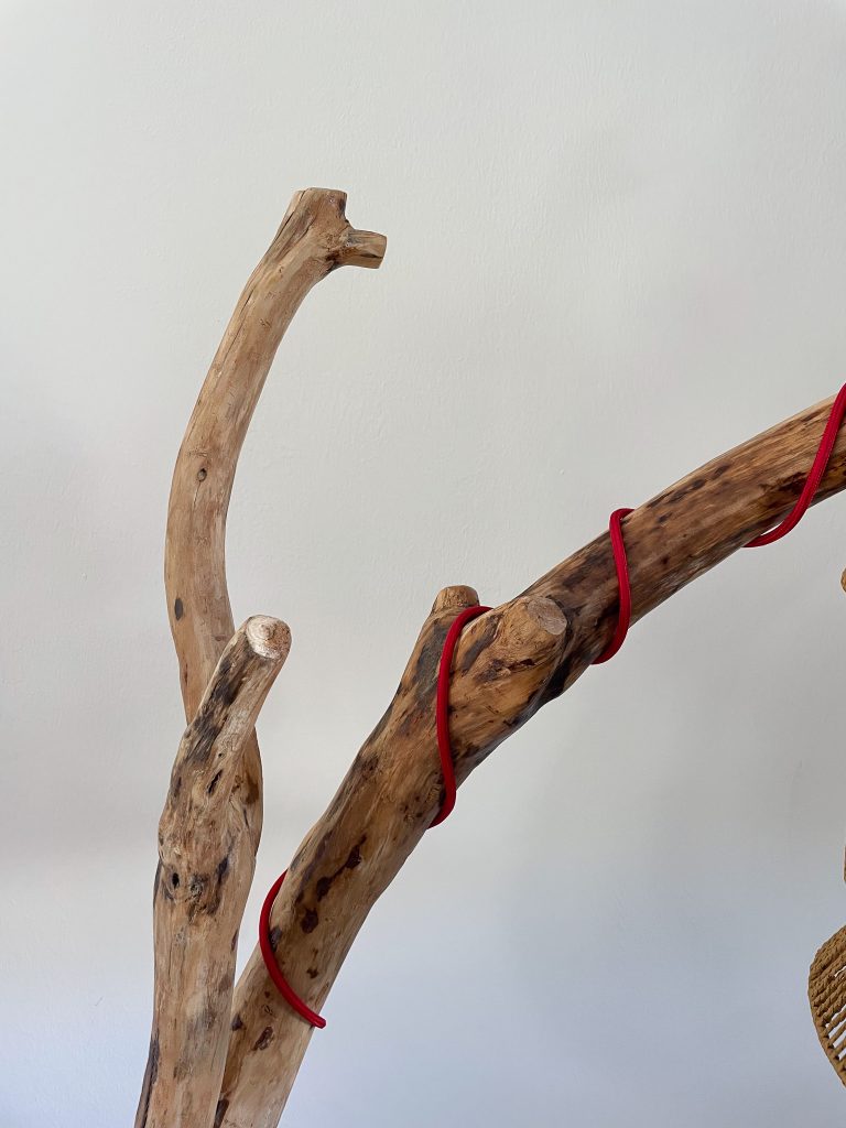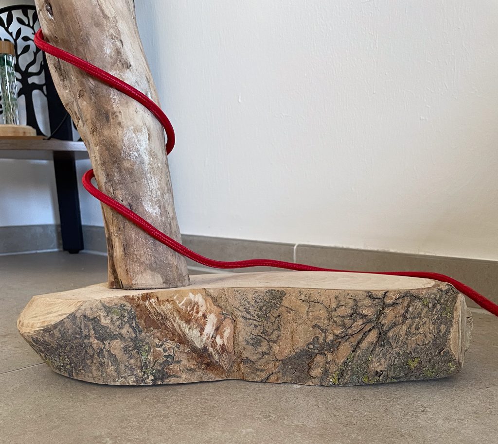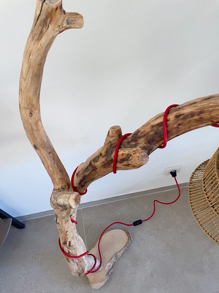 • Matériaux : Bois flotté, socle en ormeau, abat-jour sablier en corde