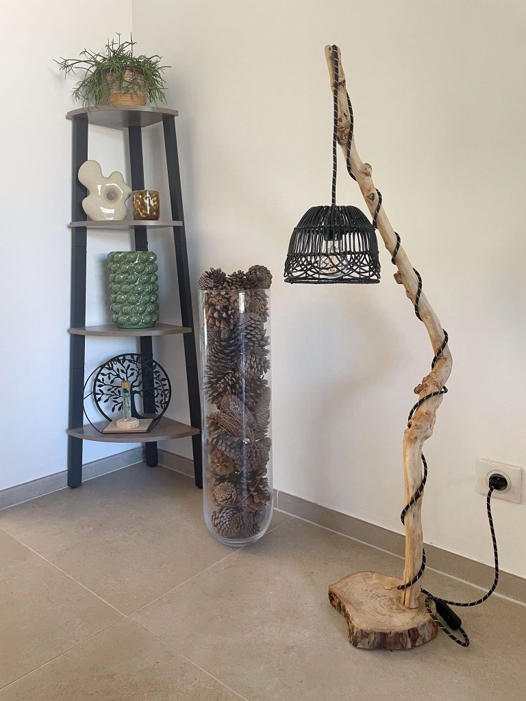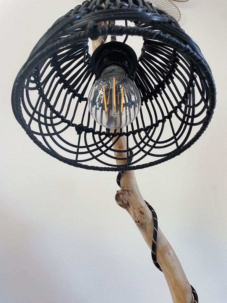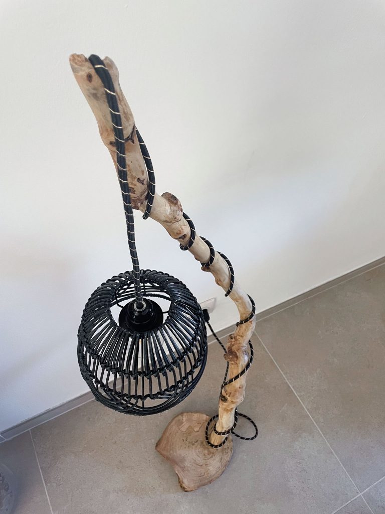 Lampe en bois Torsio: Torsio Lampe en bois esthétique et décalée – pièce unique Sa branche naturellement torsadée lui donne du charactèreLa lampe marie l’esthétique brute de la nature à l’élégance artisanaleLe câble noir apporte un contraste subtil et moderne Caractéristiques : Design unique : Chaque lampe est fabriquée à la main avec du bois naturelMatériaux : Bois de forêt, socle en ormeau, abat-jour tressé noir de style rotin, cordon noir doré torsadéFinition : bois poncé, traité et vernis Ampoule LED incluse (culot E27 – lumière chaude – 60w)Dimensions : Hauteur = 1m20 – Largeur = 35cm – abat-jour = 20cmPratique : câble avec prise secteur et interrupteur Avant Après